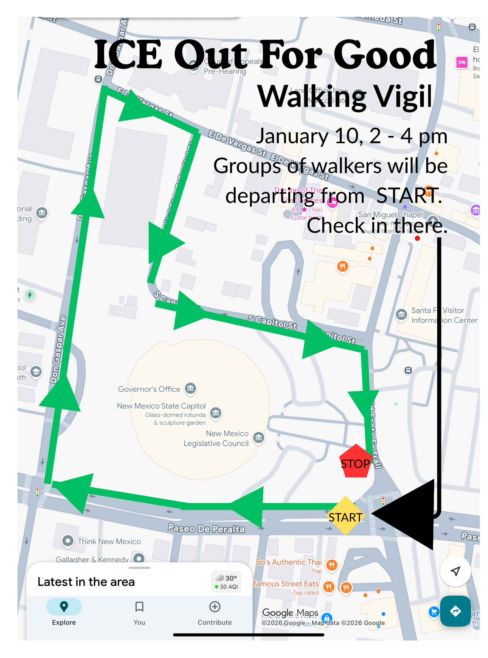 Indivisible Santa Fe is holding a walking vigil at the Roundhouse Saturday, January 10th from 2-4 (meet at the SE corner, at Paseo de Peralta and Old Santa Fe Trail) to demand ICE Get Out for Good, and to remember and honor those that ICE has killed and injured including the most recent brutal murder of an American citizen in broad daylight in Minneapolis.