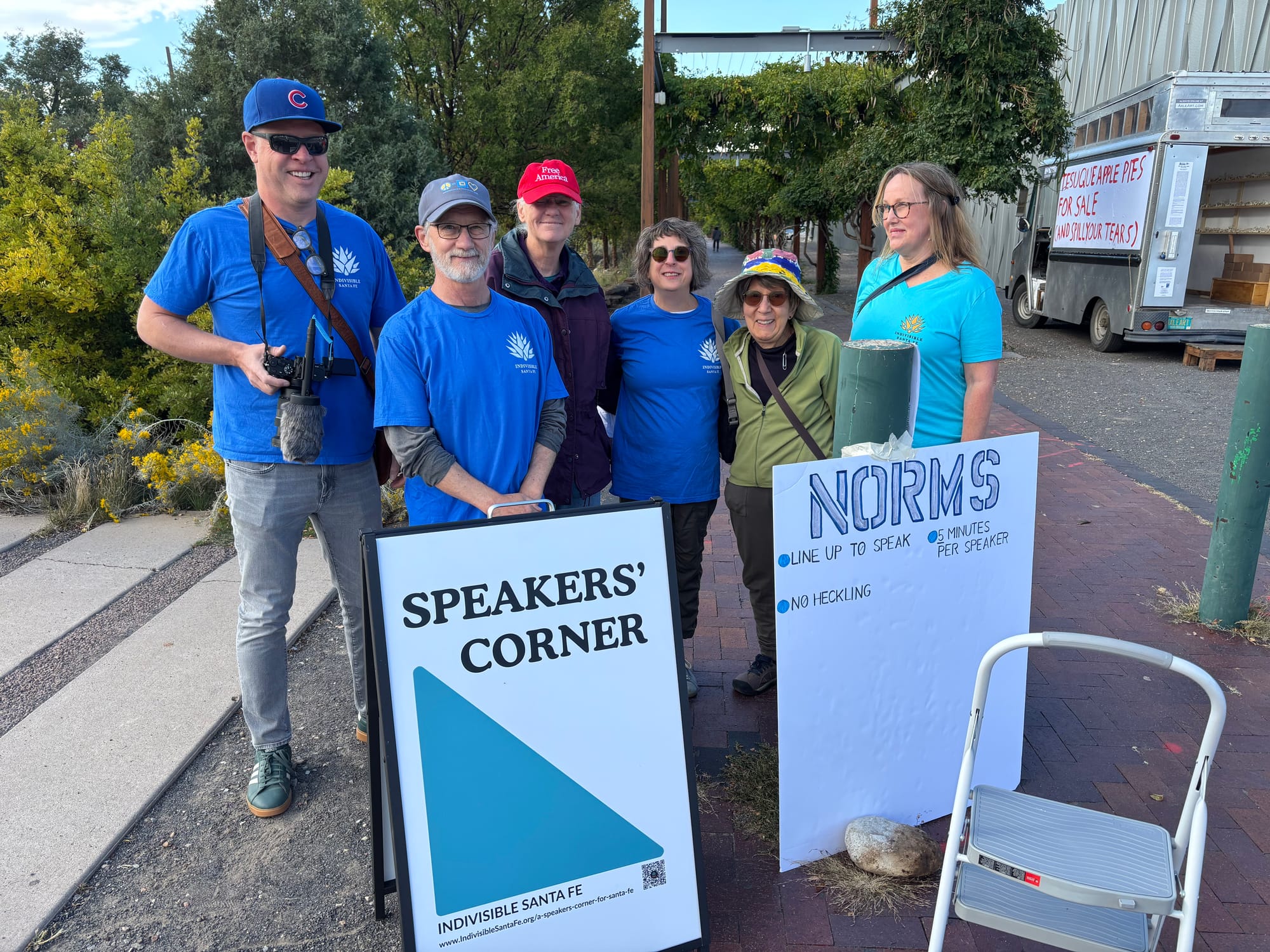 Continuing our fight for constitutional democracy and civil rights through concrete, specific, visible, and regular actions, Indivisible Santa Fe has created A Speakers' Corner for Santa Fe. A Speakers' Corner is a publicly-known area, usually located in a public park, where any person may speak without fear of governmental punishment or reprisal. Often, a Speakers' Corner is a focal point for political organizing and collective action. Our Speakers' Corner is running weekly throughout Fall 2025. Indivisible Santa Fe will lead off each week with two to four members speaking and then will open the floor to others who want to say their piece. We will be experimenting with a few locations. Next Speakers' Corner session is Saturday, November 15, 10 am to 11 am, at the Santa Fe Railyard Park, between SITE Santa Fe and the corner of Paseo de Peralta and S. Guadalupe. Look for the folks in Indivisible Santa Fe No Kings shirts and our "Speakers' Corner" sign!