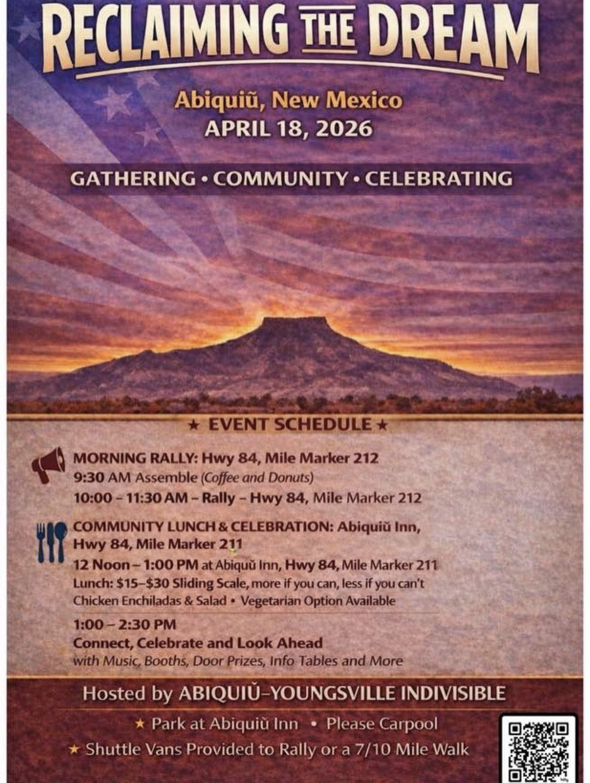 The "Reclaiming the Dream" event in Abiquiu, celebrating a year of weekly rallies along Highway 84, drew at least 40 participants. In addition to the originators of the rally from Indivisible Abiquiu / Youngsville, attendees came from other Indivisible groups including Jemez Springs, Santa Fe, Española, and Chama. (Shoutout to the Chama Chicken!)